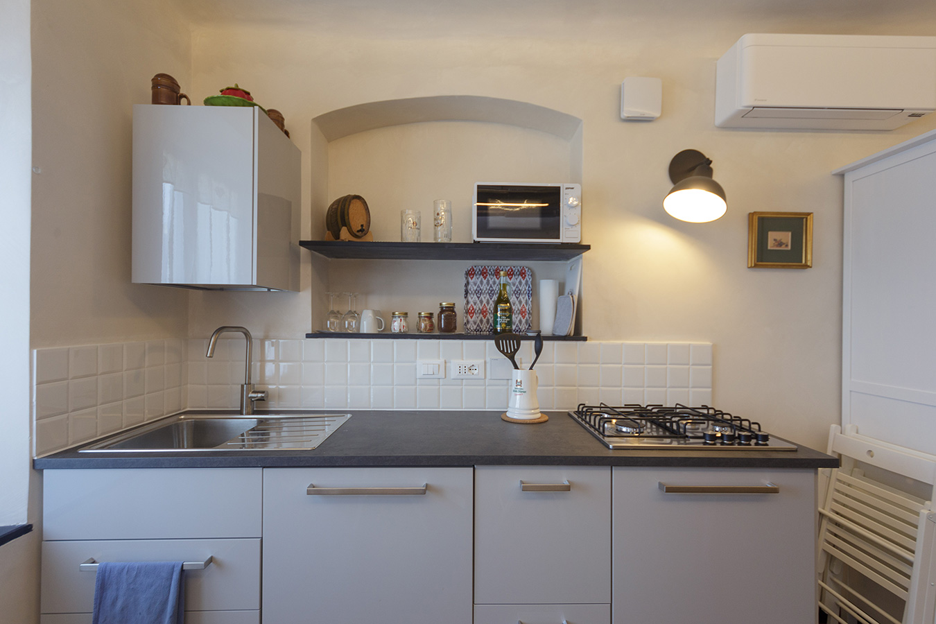 Un altro comodo divano letto (160×200) è posto nella zona giorno in cui si trova anche una cucina completa di forno, bollitore e lavastoviglie, dotata anch’essa dello stesso tipo di smart tv.